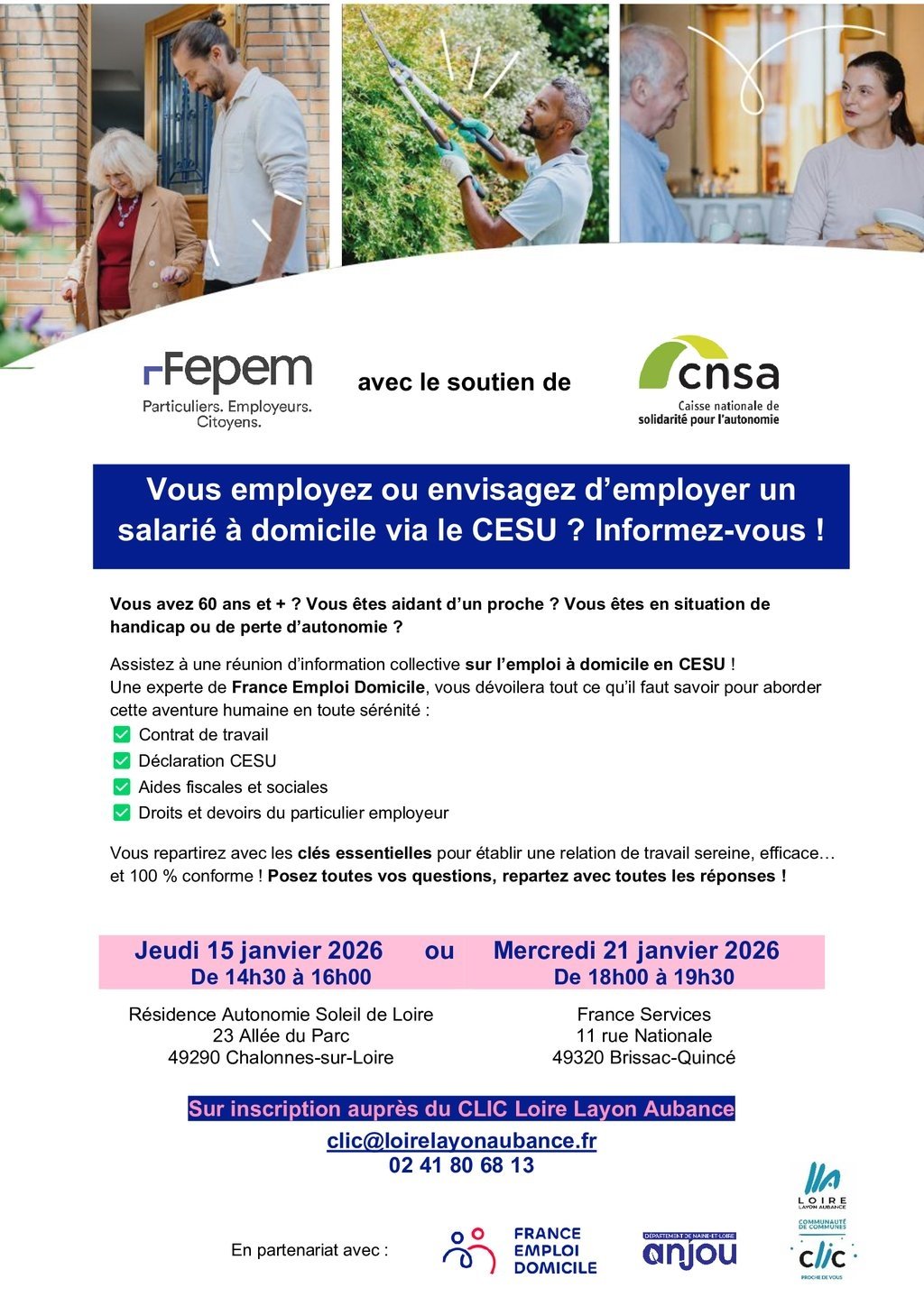 Deux réunions d’information sur le territoire du CLIC Loire Layon Aubance sur l’emploi à domicile, pour les particuliers employeurs ou futurs, en situation de perte d’autonomie ou de handicap et leurs aidants