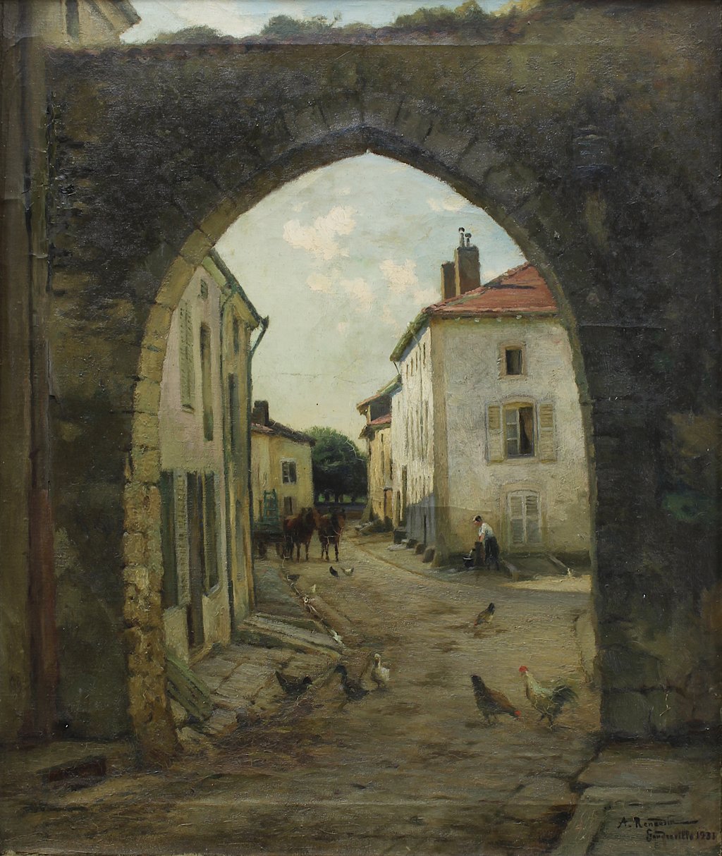 Située dans le Toulois, la localité conserve dans son patrimoine ce vestige exceptionnel datant du Moyen-Âge. Avec grande habileté, Renaudin utilise ce cadre de porte comme objectif d’une scène de la vie rurale. Au premier plan, la volaille multicolore gambade et semble voler la vedette à la Porte. Au second plan, un homme discret vaque à ses occupations et remplit son seau d’eau tandis que des chevaux tirant une voiture s’approchent du spectateur pour franchir la Porte. Le décor reste authentique dans le jus de ce qu’il pouvait être au 16ème siècle avec ses maisons typiques et son charme d’antan.