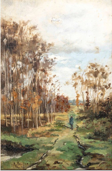 Début décembre dernier, la maison de ventes parisienne Redondy et Chamla a proposé aux enchérisseurs une belle vacation d’art en tout genre. Parmi les lots se trouvait une œuvre de René Veillon. Cela n’était pas arrivé depuis 7 ans avec la toile non vendue à Bayeux représentant une ferme aux alentours de Saint-Céneri. Signée et datée 1882 en bas à gauche, celle-ci offre un paysage de forêt difficilement localisable. L’année d’exécution peut tout de même permettre de la situer dans sa région natale car Veillon n'a alors que 18 ans ! Malgré quelques accidents et son format 32 X 22 cm, l’huile sur toile a été adjugée à 120 €.