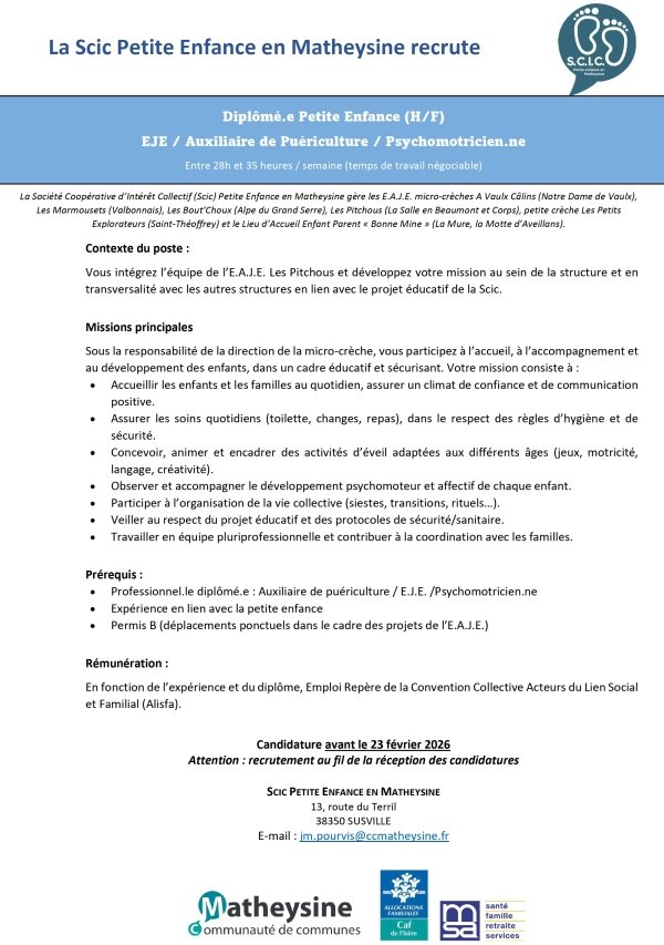 Pour en savoir plus : https://mairiedevalbonnais.fr/Actualite/2026-02-04-OffreEmploi-SCIC-PetiteEnfance.pdf