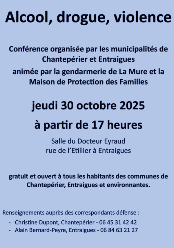 CONFÉRENCE sur "ALCOOL, DROGUE, VIOLENCE" ANIMÉE PAR LA GENDARMERIE, à 17h00