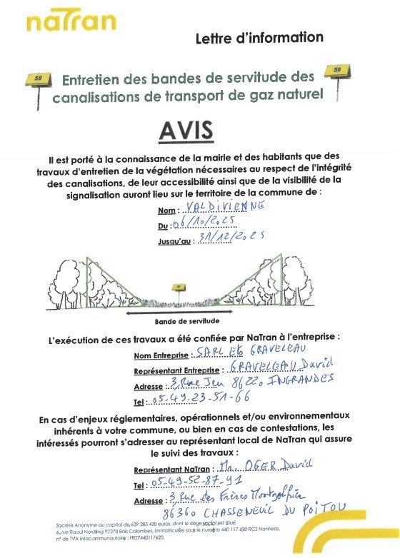 Entretien des bandes de servitude des canalisations de transport de gaz naturel sur la commune de Valdivienne