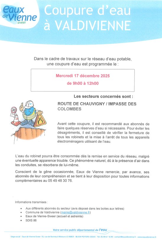 Attention coupure d'eau le 17 décembre de 9h à 12h