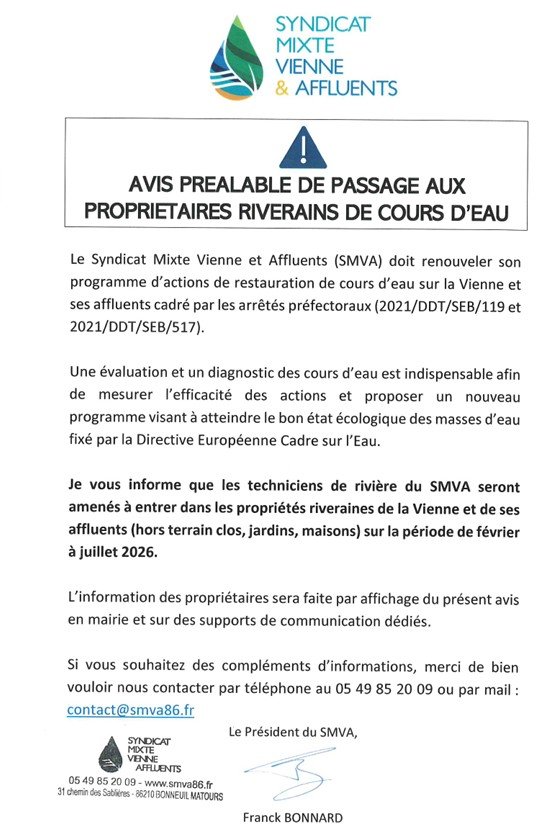 AVIS PREALABLE DE PASSAGE AUX PROPRIETAIRES RIVERAINS DE COURS D'EAU