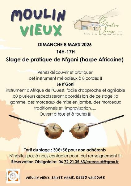 Le N'Goni : instrument d'Afrique de l'Ouest, facile d’approche et agréable où plusieurs aspects seront abordés lors de ce stage : la gamme, des morceaux de mise en jambe, des morceaux traditionnels et l'improvisation..... Ouvert à tous et à toutes !!!