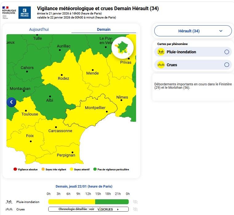 Météo-France a placé le département de l’Hérault en vigilance jaune pluie-inondations ce jeudi 22 janvier, jusqu’au début de l’après-midi.