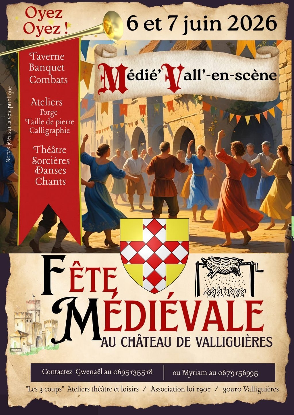 Message des organisateurs : 'Oyez, Oyez ! Troubadours, ménestrels, dames et damoiseaux ! Venez festoyer les 6 et 7 juin 2026 au château de Valliguières. Votre aide est la bienvenue. Contact Gwenaël Chamorro au 06 95 13 55 18.