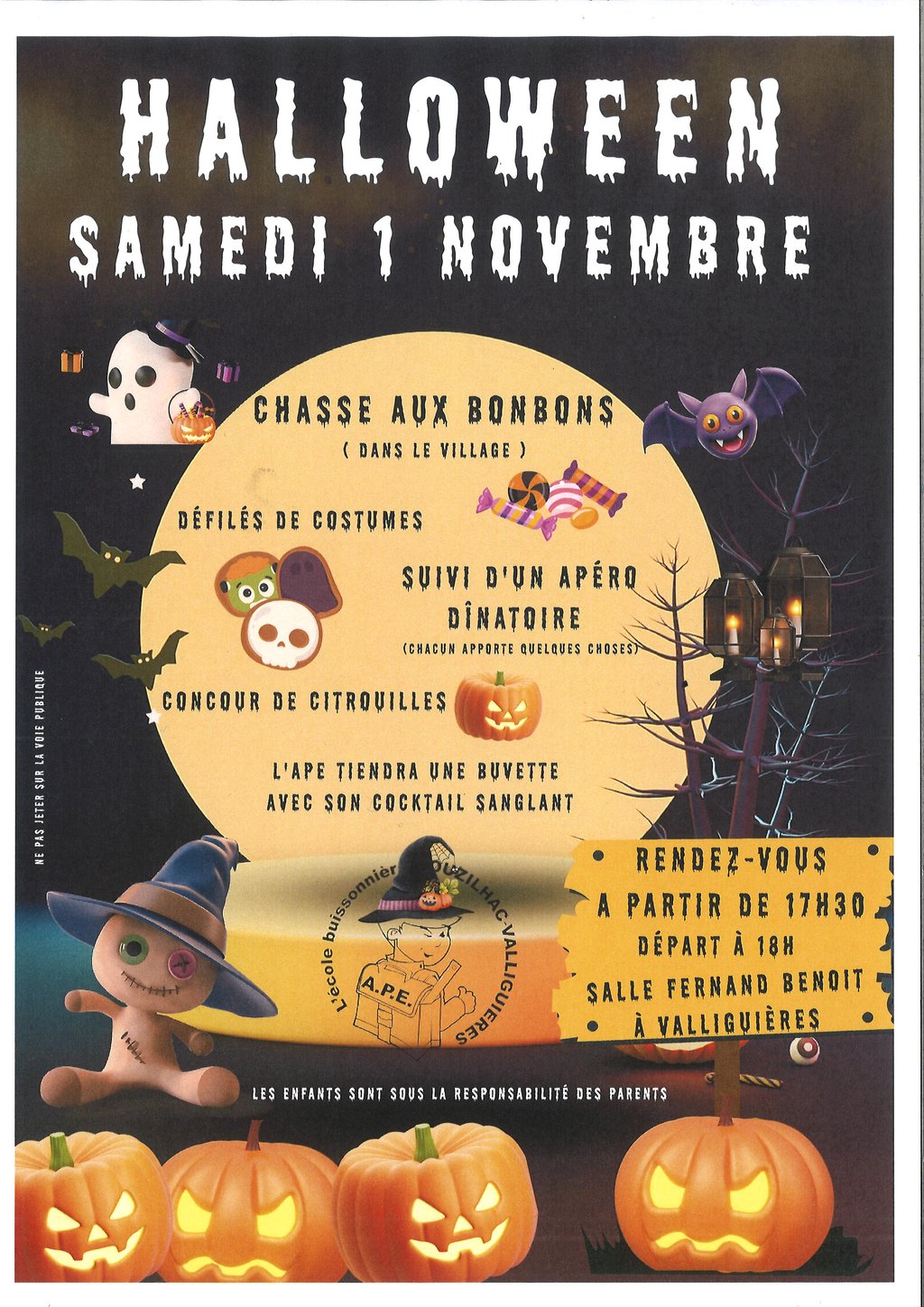 Samedi 1 novembre : défilé et soirée Halloween proposée par l'APE Valliguières Pouzilhac.