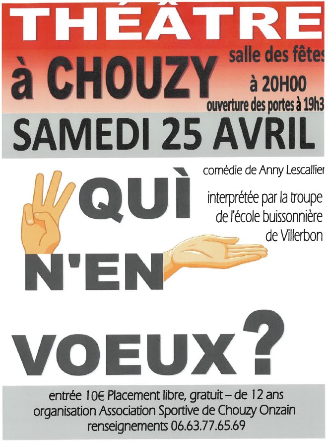 L'Association Sportive de Chouzy/Onzain organise une représentation théâtrale à la salle des fêtes de Chouzy-sur-Cisse le samedi 25 avril.