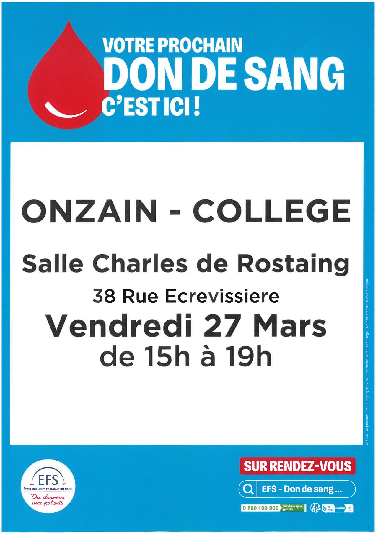 Prochain don du sang à Onzain salle Charles de Rostaing 38 rue Ecrevissière vendredi 27 mars de 15h à 19h