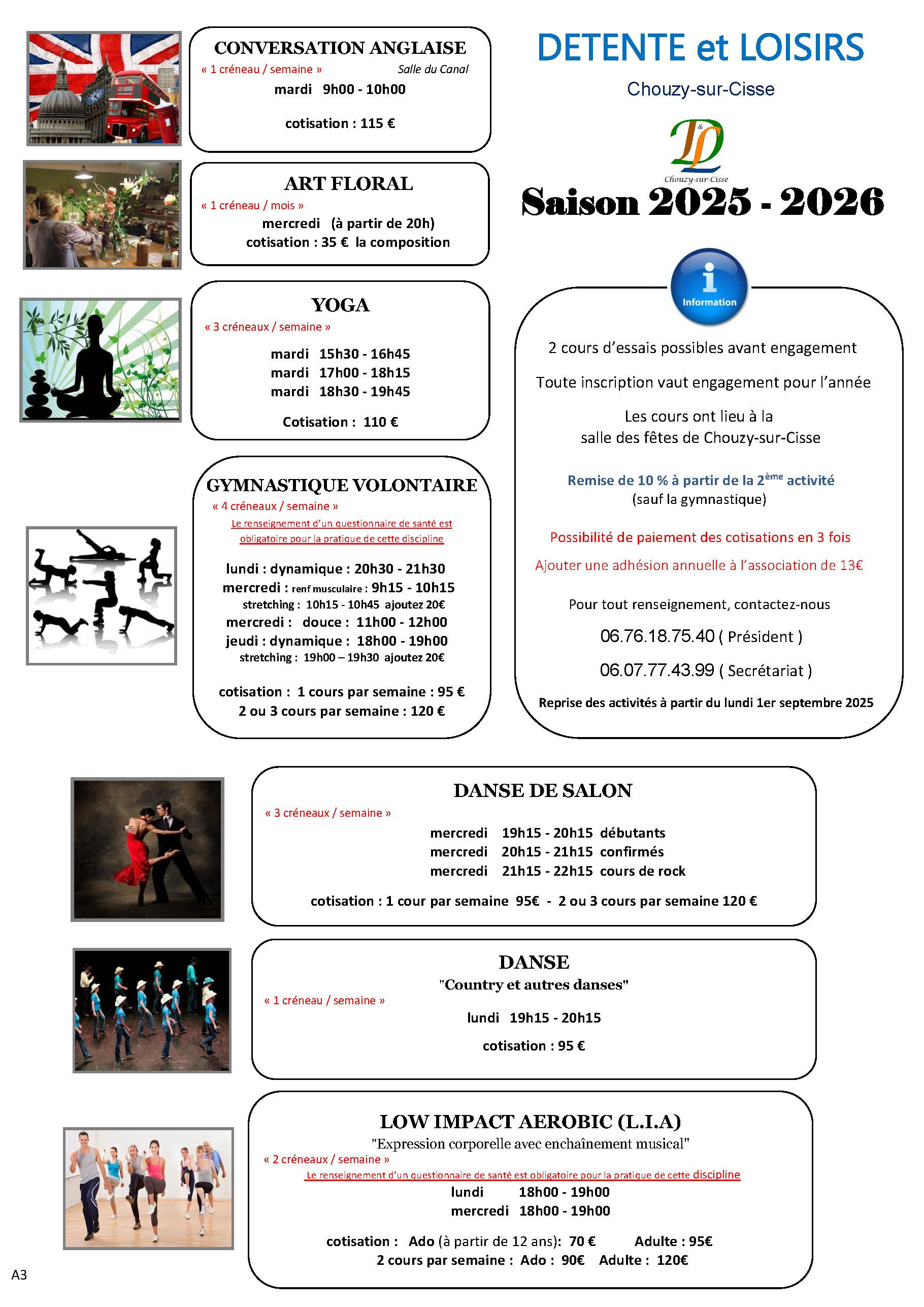 Deux séances gratuites sont offertes pour vous permettre de découvrir les cours. Si vous souhaitez obtenir des renseignements ou recevoir notre plaquette, n’hésitez pas à nos contacter (coordonnées et mail ci-dessous).