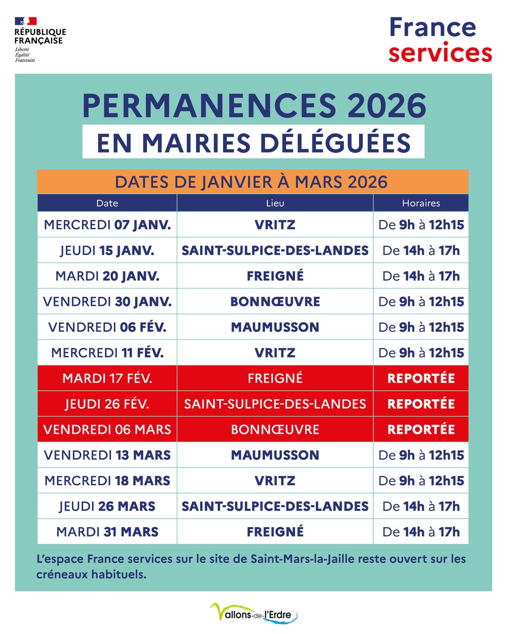 ⚠ Les permanences du mardi 17 février (Freigné), jeudi 26 février (Saint-Sulpice-des-Landes) et vendredi 6 mars (Bonnoeuvre) sont reportées ultérieurement.