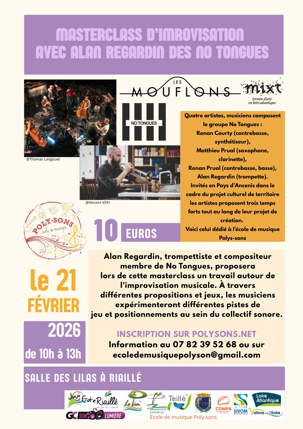 - Samedi 21 février de 10h à 13h à la salle des Lilas (Riaillé) : Stage Improvisation avec le groupe No Tongues