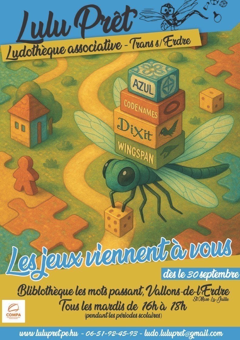 Lulu Prêt’ existe depuis 10 ans sur la commune de Trans-sur-Erdre et à partir du 30 septembre, elle va se rapprocher de vous en tenant des permanences le mardi de 16h à 18h à la bibliothèque de Vallons-de-l'Erdre (Saint-Mars-la-Jaille). Vous pourrez donc emprunter des jeux lors de ces permanences.