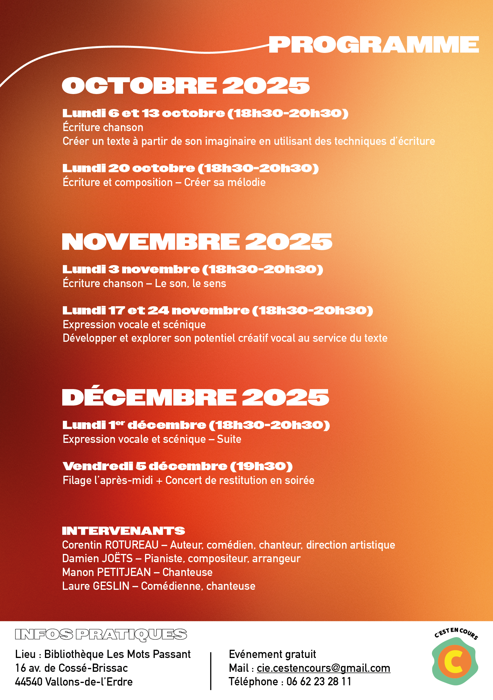 Pour des informations sur le contenu du cycle d’atelier, vous pouvez contacter la cie C’est en cours au 06 62 23 28 11 ou cie.cestencours@gmail.com.