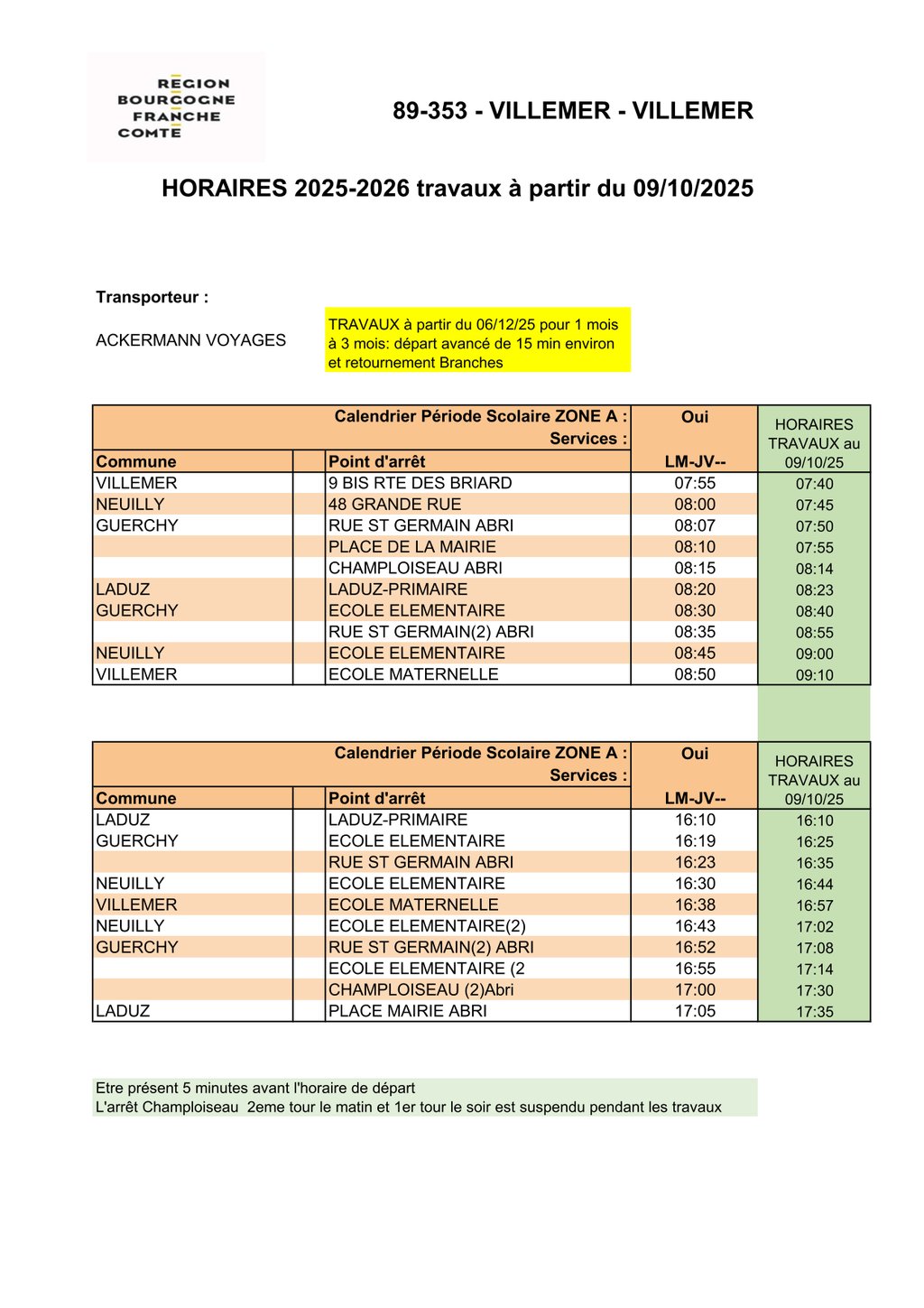 Après deux jours de test et afin de gagner un peu de temps sur le parcours, l'arrêt "CHAMPLOISEAU ABRI" ne sera desservi qu'au premier passage le matin et au deuxième le soir.