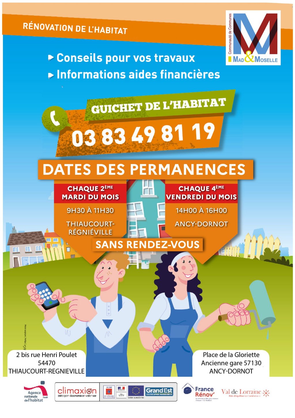 Dans le cadre de la dynamique de rénovation de l’habitat, la communauté de communes Mad et Moselle accueille sur son territoire des permanences tout au long de l’année, selon une fréquence fixe : le 2ᵉ mardi et le 4ᵉ vendredi de chaque mois.