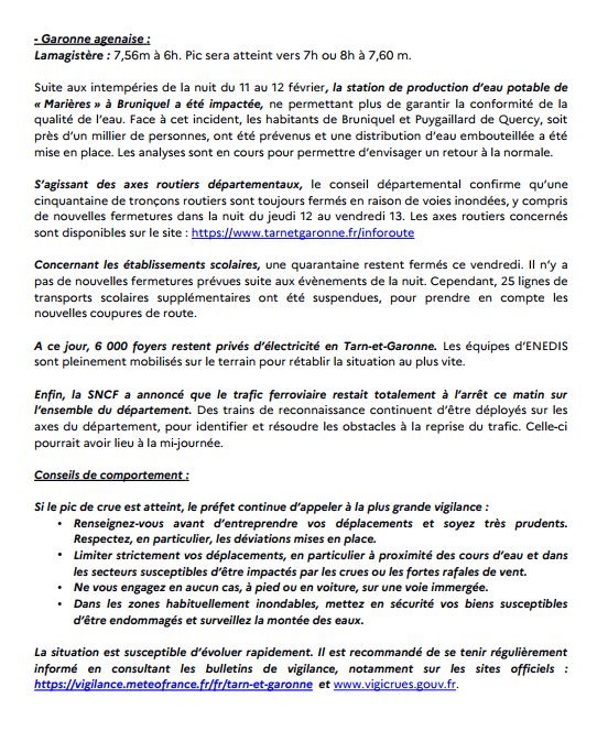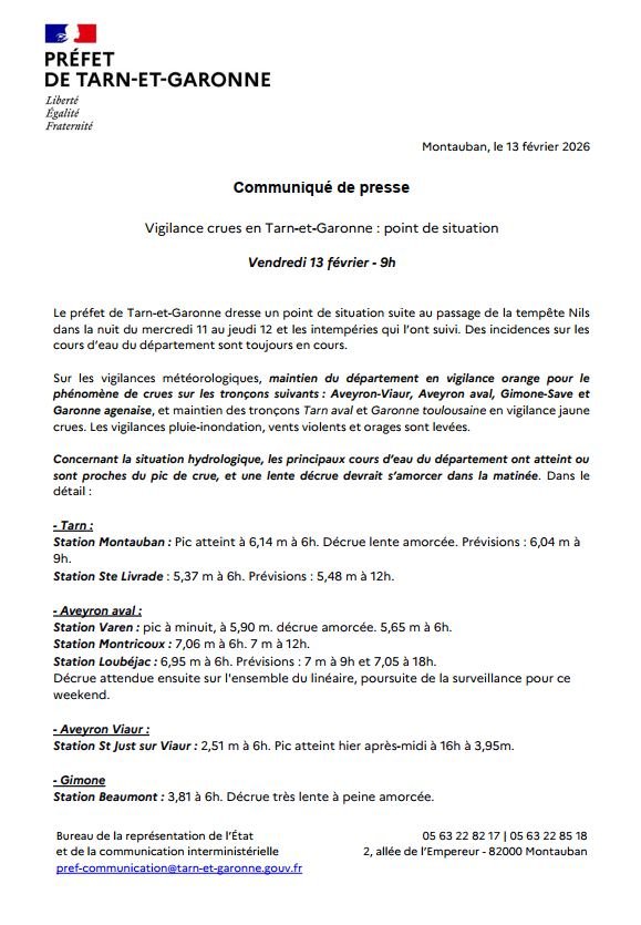 Le préfet de Tarn-et-Garonne dresse un point de situation suite au passage de la tempête Nils et les intempéries qui se poursuivent. Des incidences sur les cours d’eau du département sont toujours en cours.
