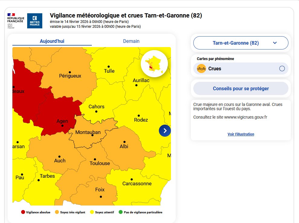 Les pluies des derniers jours ont conduit à une crue importante du tronçon Aveyron aval, en particulier dans les secteurs de Varen, Montricoux et Loubéjac, où le pic de crue a été atteint vendredi en fin d'après-midi. La décrue est généralisée. Toutefois, les niveaux restent élevés et des débordements généralisé sont encore en cours dans le secteur de Montricoux, justifiant le maintien en vigilance orange.