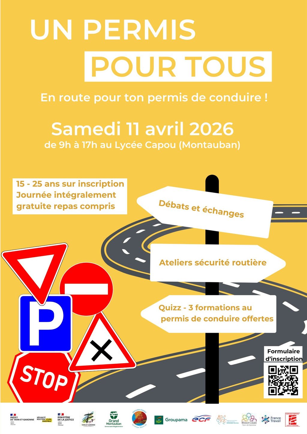La prochaine session de la journée « 1 permis pour tous » aura lieu le samedi 11 avril 2026 au lycée Capou de Montauban, à destination de jeunes de 15 à 25 ans.