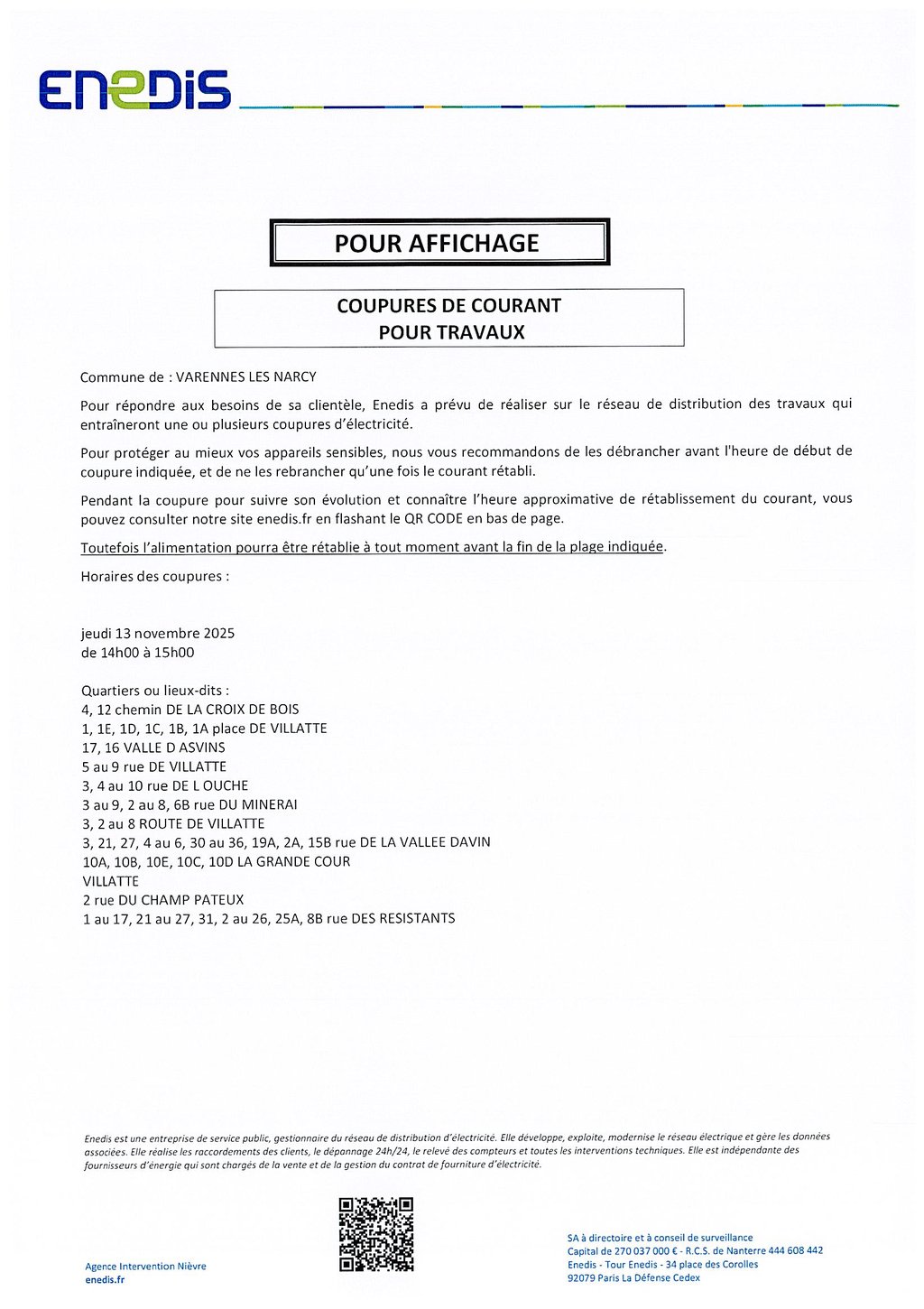 Enedis nous informe que des travaux sont prévus le lundi 10 Novembre 2025 de 9H00 à 10H00 sur PAssy les Tours.