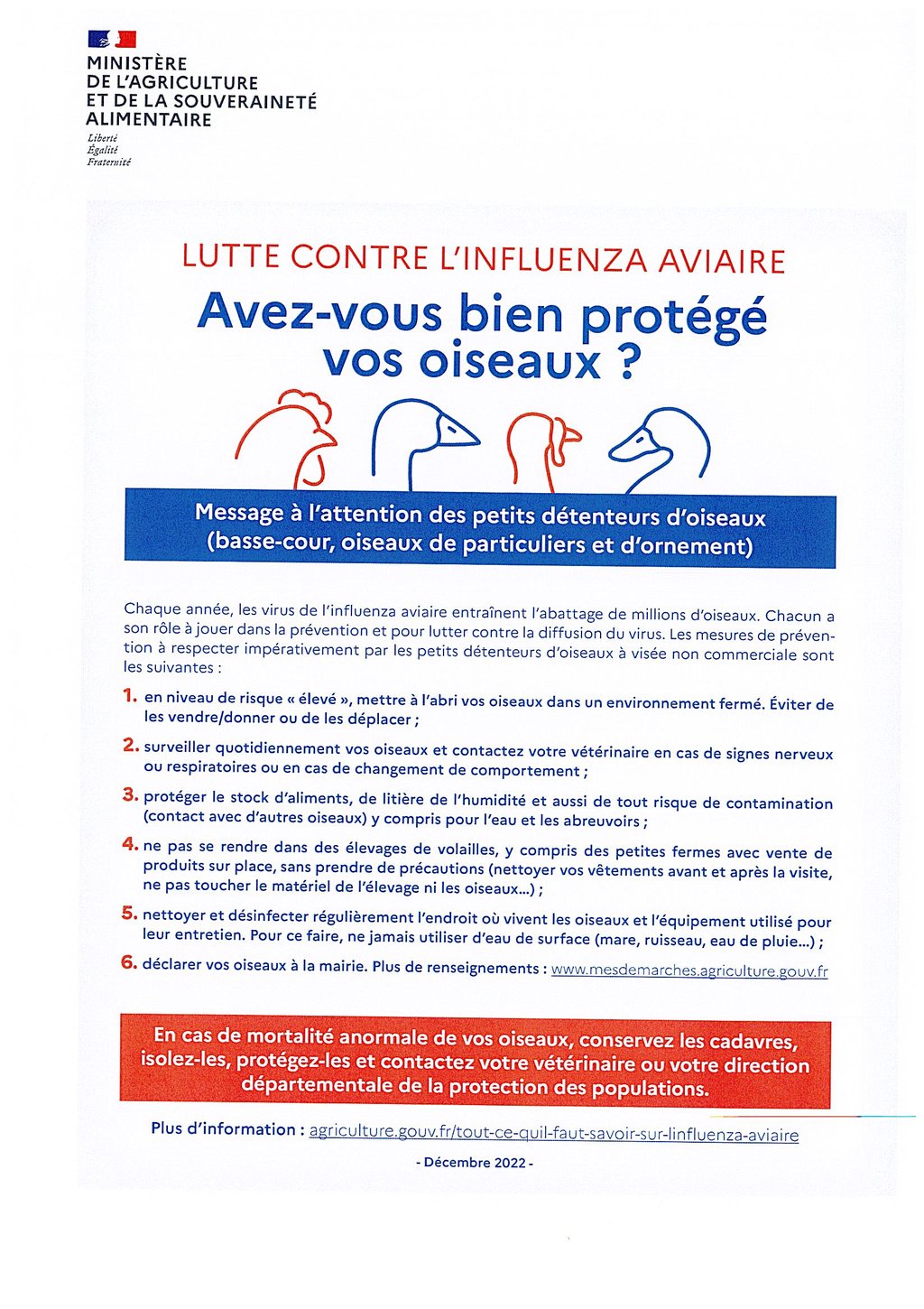 Veuillez trouver ci-joint le message du Ministère de l'Agriculture et de la Souveraineté Alimentaire à destination des détenteurs d'oiseaux.