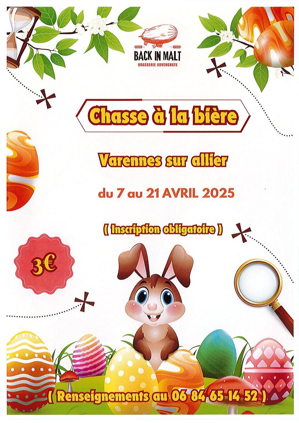 Mais ce n'est pas tout ! En effet, le lundi de Pâques, 21 avril de 9:00 à 11:00, un jeu de piste aura lieu dans les rues de Varennes avec des bières (vraies bouteilles mais uniquement de l'eau à l'intérieur). Avec un maximum de bouteilles collectées, un rendez-vous sera donné à la brasserie Back in malt (21, rue du Quatre septembre à Varennes), pour un moment surprise avec remise de cadeaux aux gagnants.