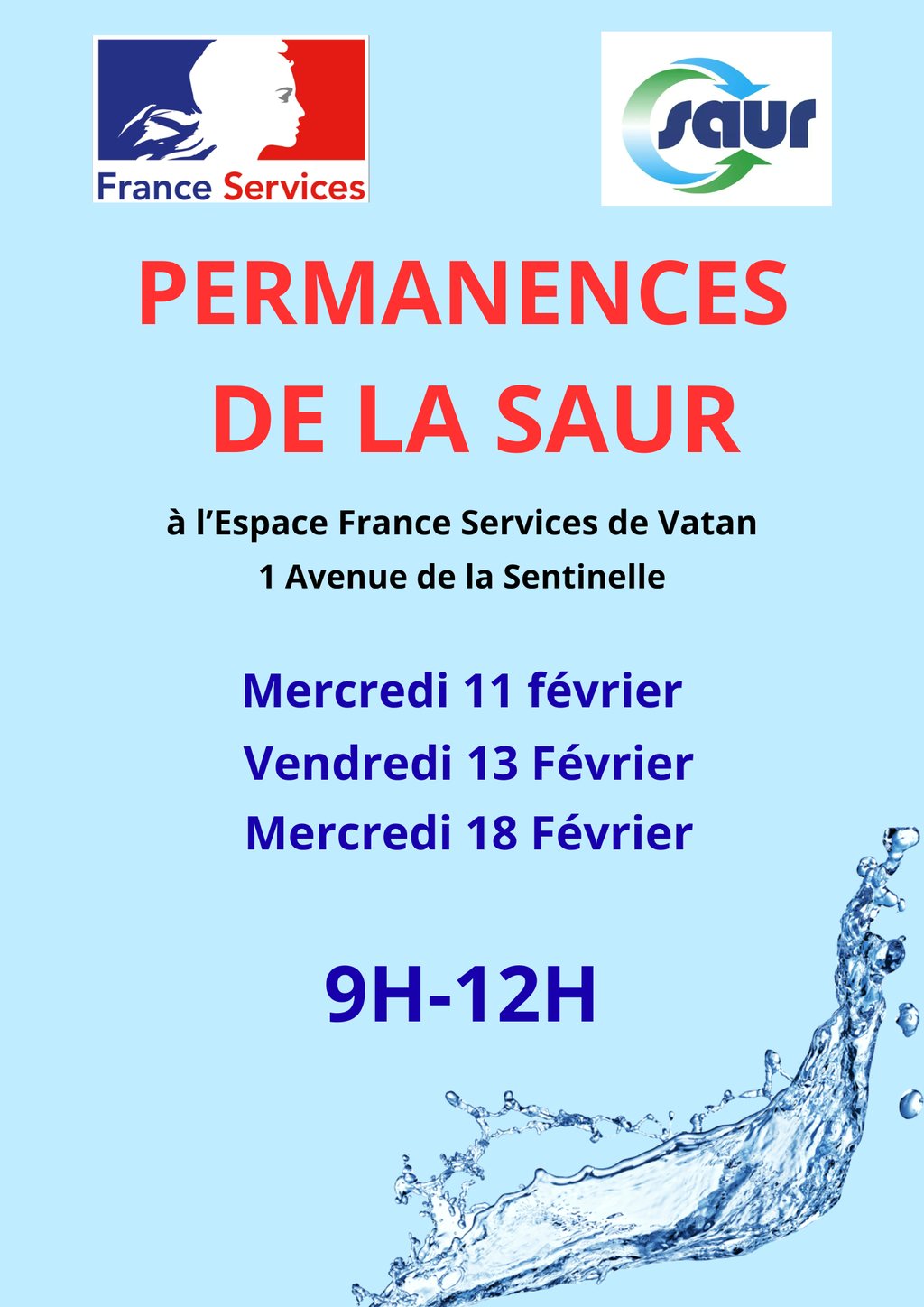 Nous vous informons des permanences de la SAUR à France Services Vatan (1 avenue de la Sentinelle) les 11, 13 et 18 février de 9h à 12h.