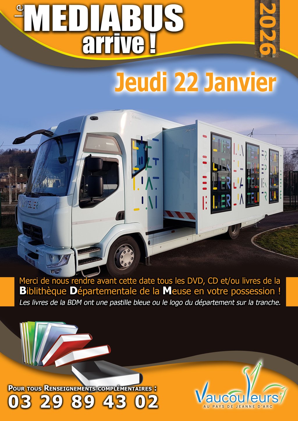 Le MEDIABUS sera à Vaucouleurs le jeudi 22 Janvier 2026, merci de nous rendre avant cette date tous les DVD, CD et/ou livres de la Bibliothèque Départementale de la Meuse en votre possession !