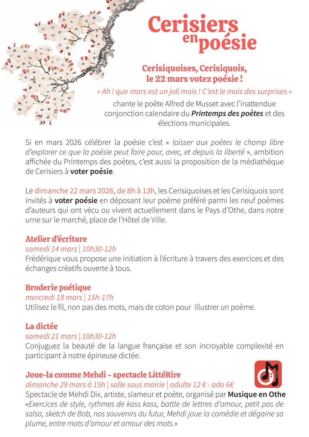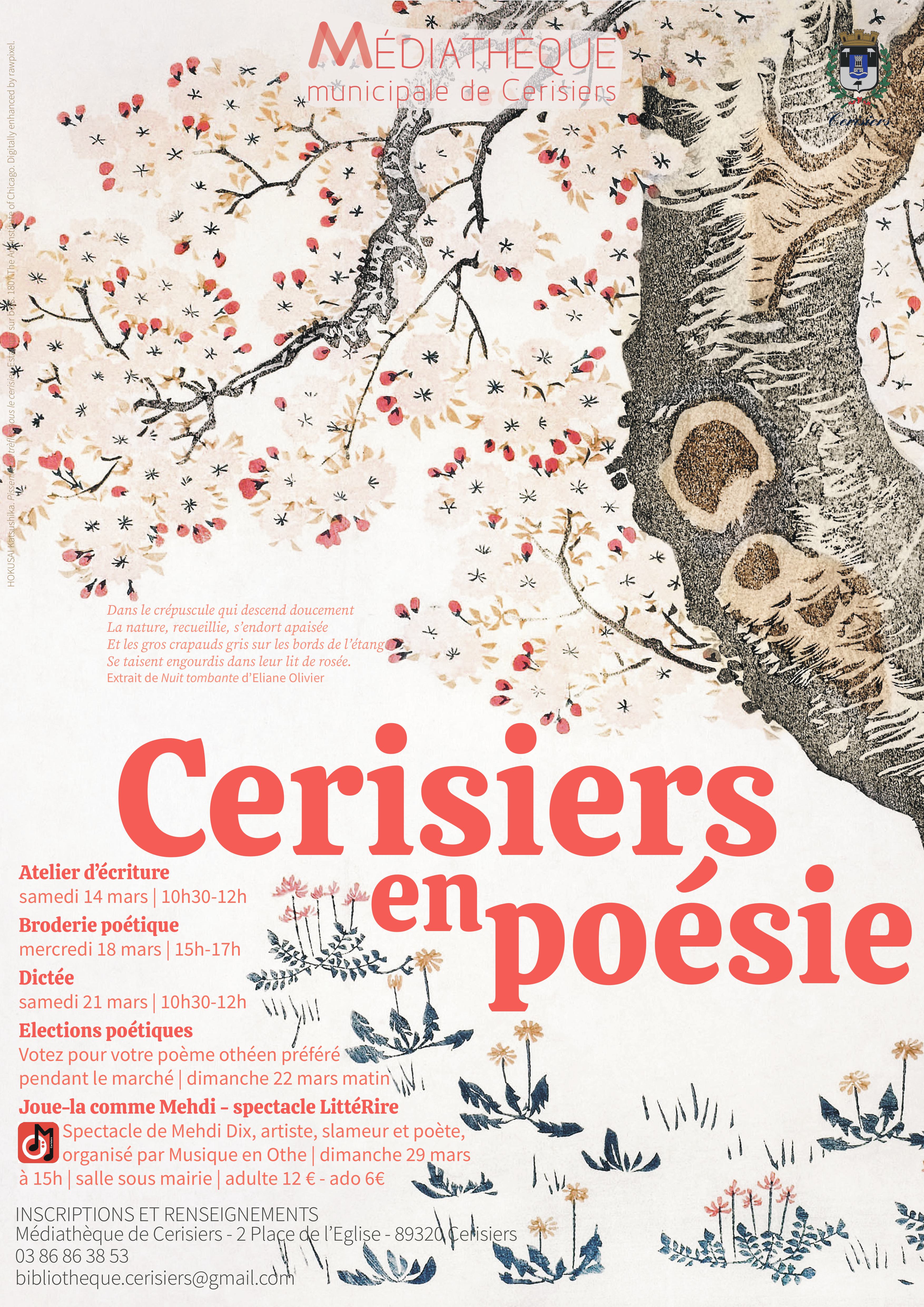 Le dimanche 22 mars 2026, de 8h à 13h, les Cerisiquoises et les Cerisiquois sont invités à voter poésie en déposant leur poème préféré parmi les neuf poèmes d’auteurs qui ont vécu ou vivent actuellement dans le Pays d’Othe, dans notre urne sur le marché, place de l’Hôtel de Ville.