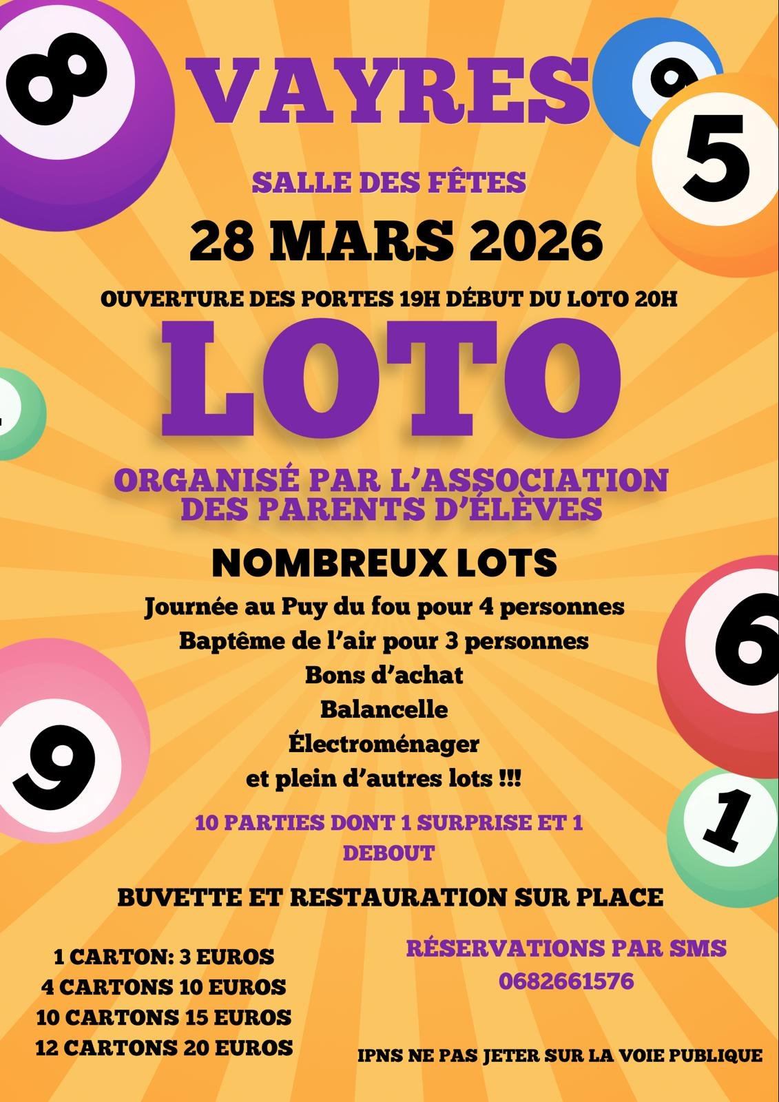 L'association des parents d'élèves organise un Loto samedi 28 mars 2026 à 20h00 à la salle des fêtes.
