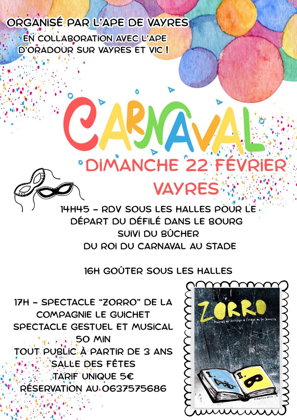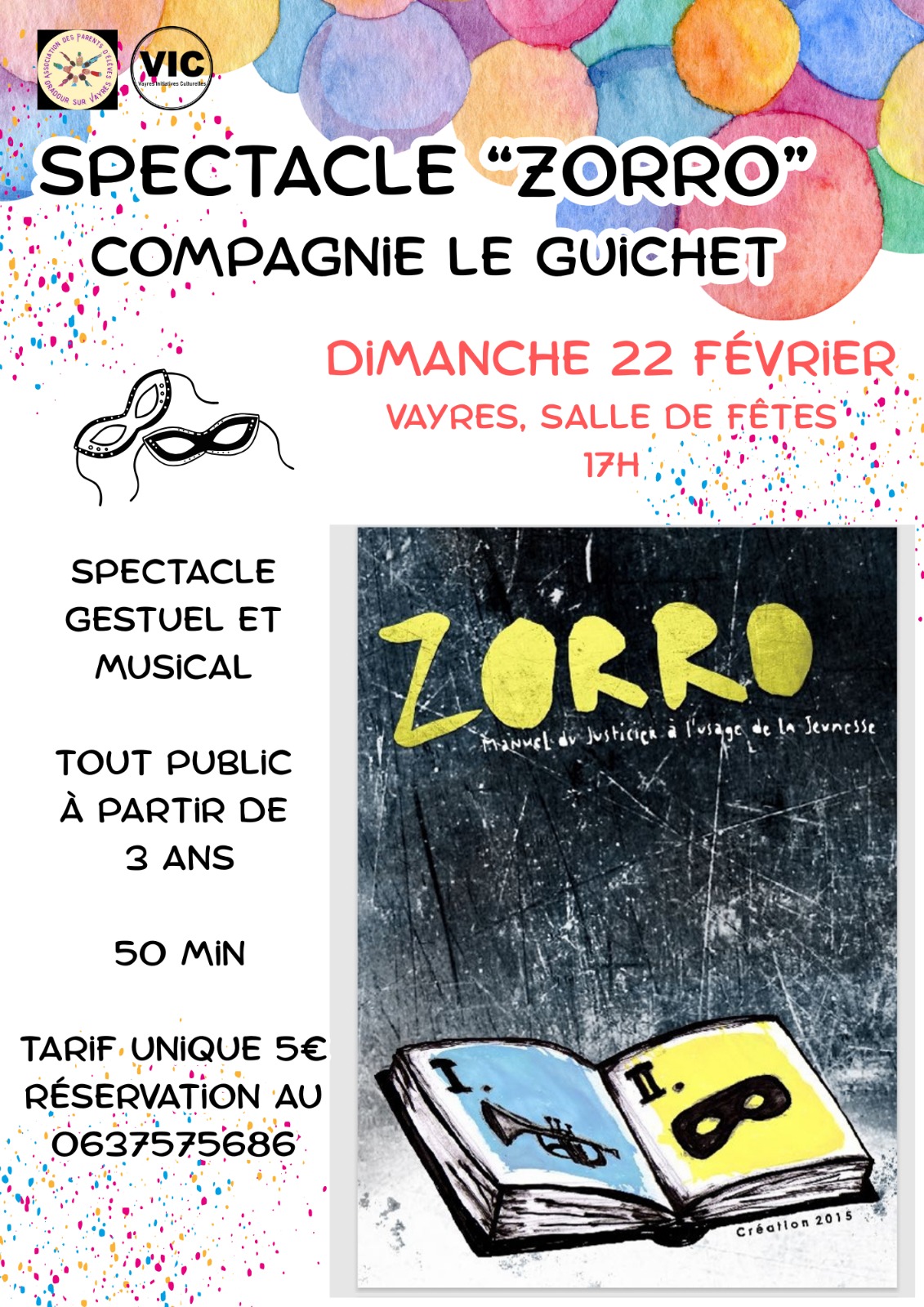 V.I.C. organise une journée carnaval dimanche 22 février à partir de 14h45 sous la halle du champ de foire ainsi qu'un spectacle Zorro à 17h00 à la salle des fêtes.