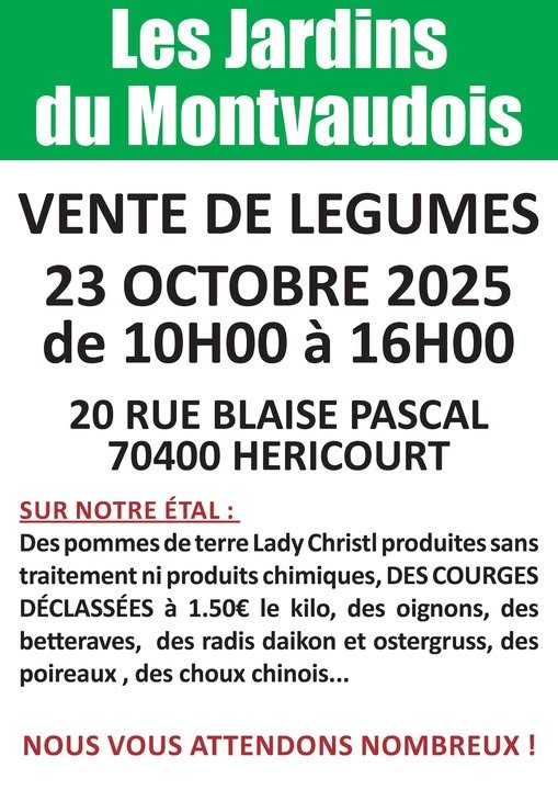 Les Jardins du Mont Vaudois organisent un marché exceptionnel le jeudi 23 octobre 2025 de 10h à 16 h sur le site (20, rue Blaise Pascal à Héricourt).