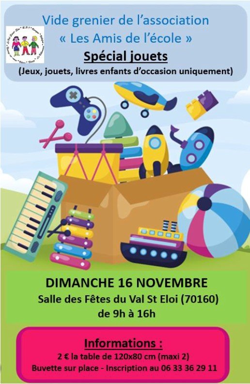 1er Vide grenier "spécial jouets" organisé par Les Amis de l'Ecole, à l'intérieur de la salle des fêtes du Val Saint Eloi.