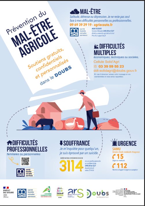 Aussi, vous trouverez ci-joint une affiche /flyer qui donne des contacts pour prévenir du mal-être agricole.