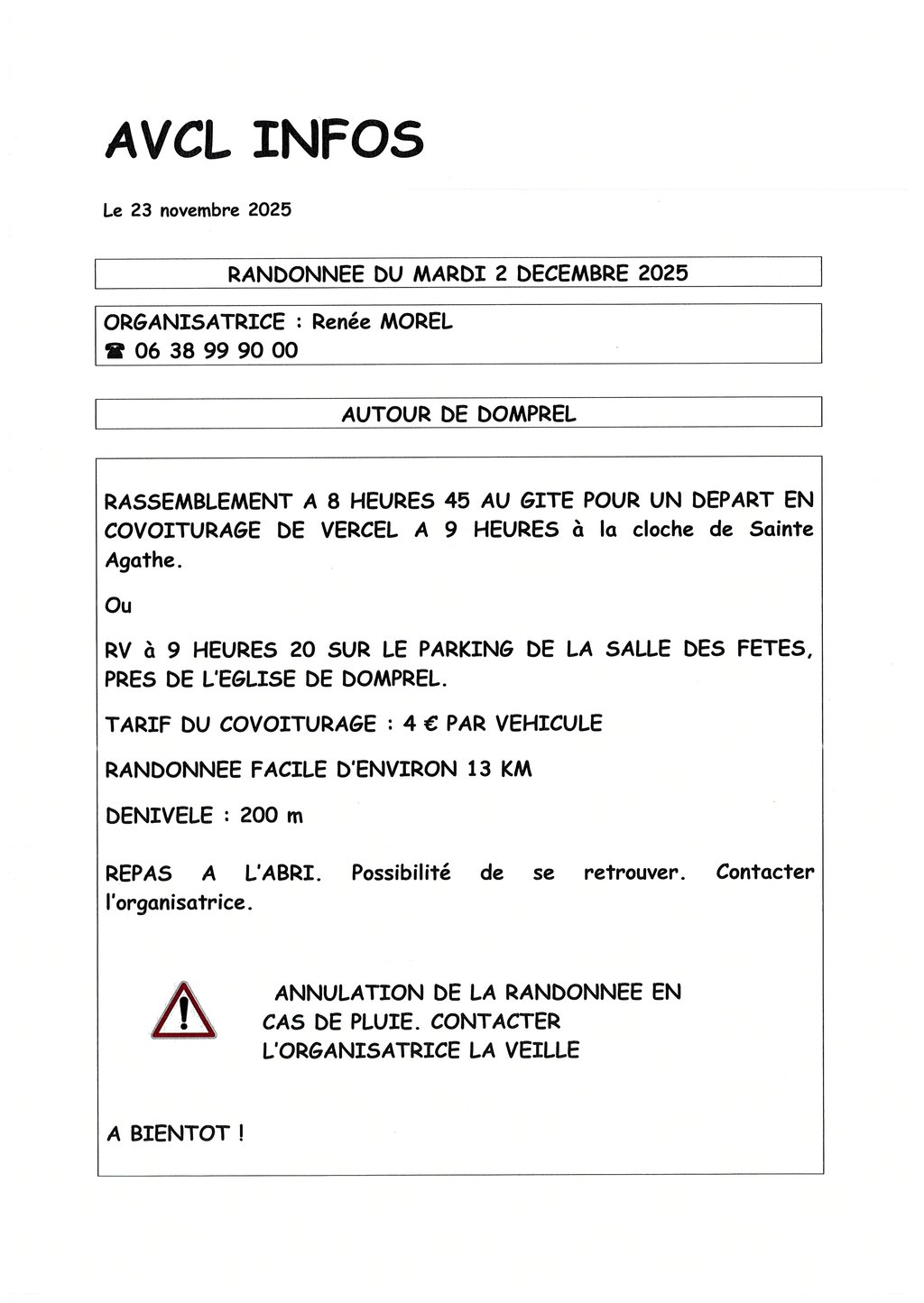 AVCL INFOS RANDONNEE DU MARDI 2 DECEMBRE