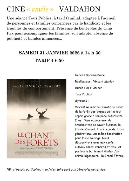 Une nouvelle séance ciné « Smile » (ciné pour tous) - Une séance Tous Publics, à tarif familial, adaptée à l’accueil de personnes et familles concernées par le handicap et les troubles du comportement. Présence de bénévoles du Ciné Pax pour accompagner les familles, son adapté, absence de publicité et bandes annonces. Projection du film «Le Chant des forêts ».