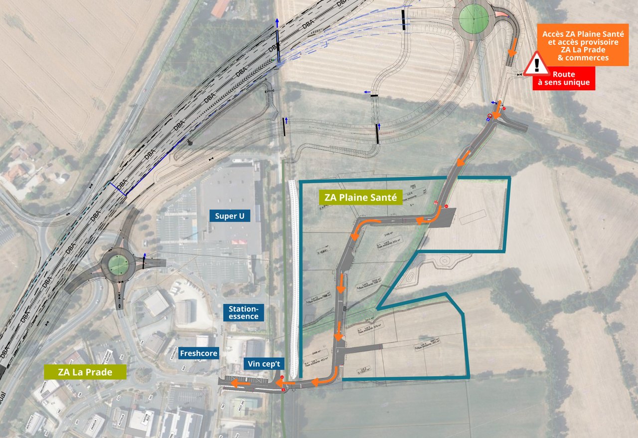Mise en circulation à sens unique, elle permet de desservir le Parc d'Activités Plaine Santé tout en améliorant provisoirement l’accès à la Zone d’Activités de la Prade durant les travaux de l'autoroute.
