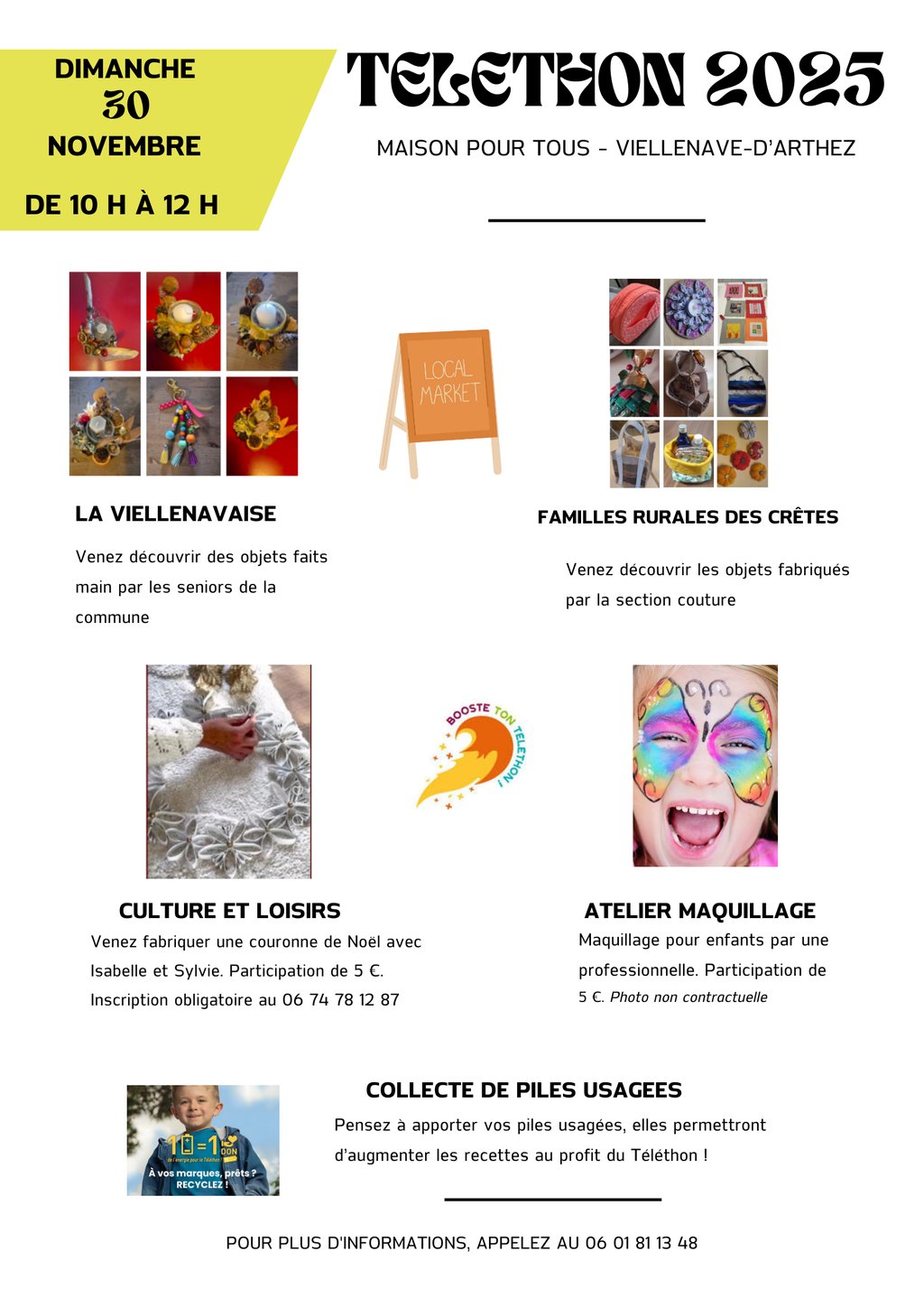 Venez découvrir les objets faits main par les associations locales et les ateliers "confection de couronne de Noël" et "maquillage enfants" de 10 h à 12 h environ - Entrée gratuite