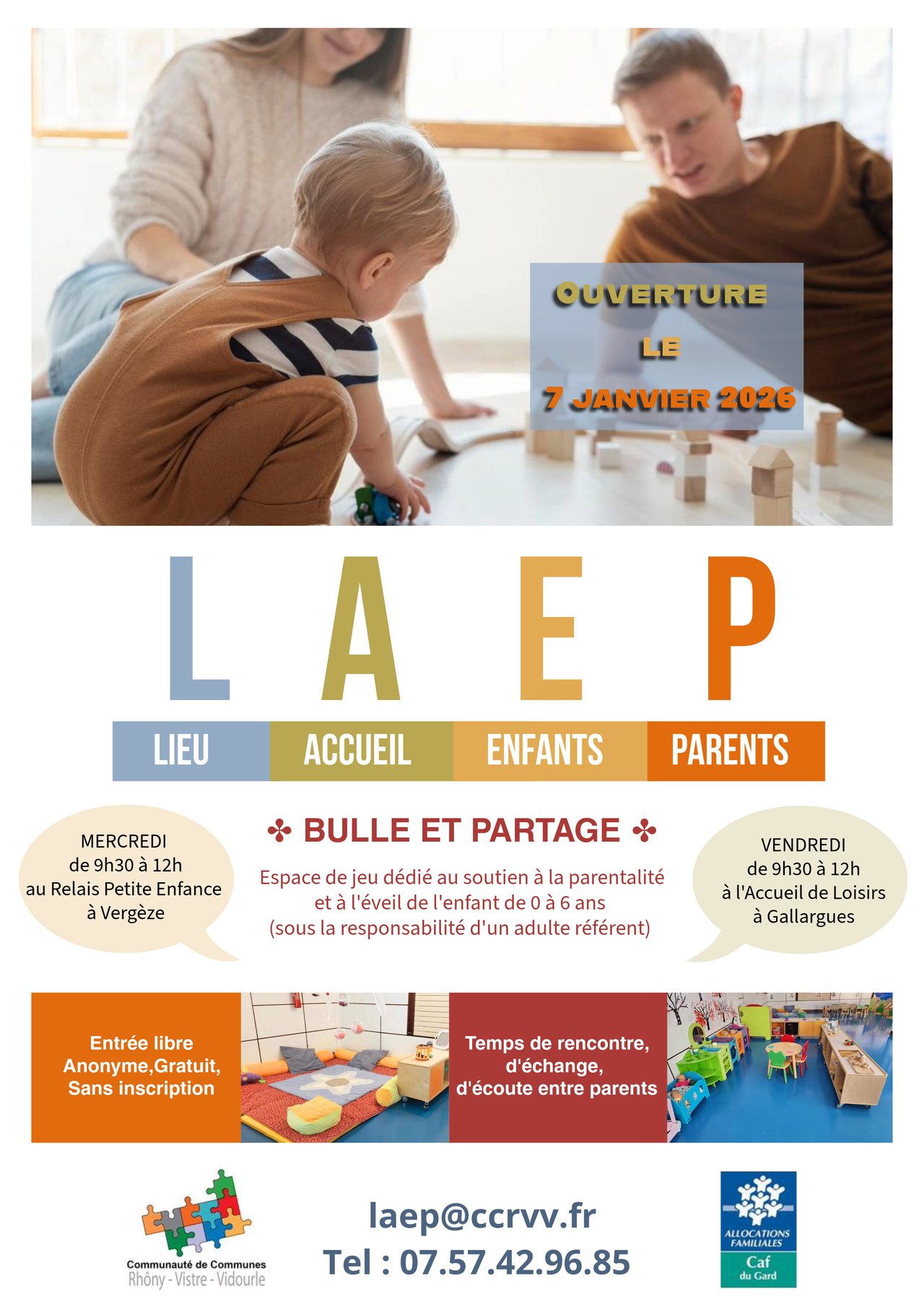 La Communauté de Communes Rhôny Vistre Vidourle (CCRVV) a le plaisir de vous informer de l’ouverture du Lieu d’Accueil Enfants Parents (LAEP) «Bulle et Partage», après les vacances d'hiver.