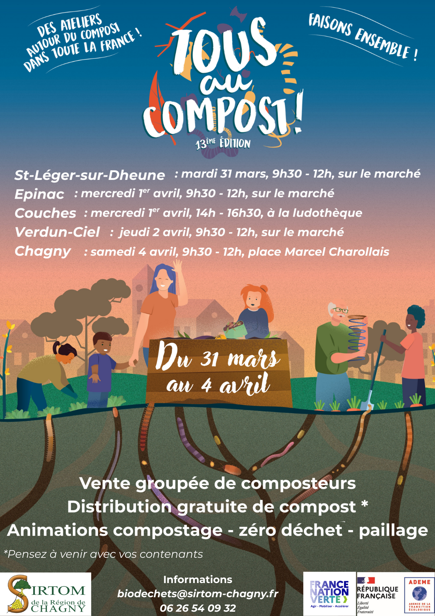 Nous serons présents sur les communes de Saint léger sur Dheune, Epinac, Couches, Verdun-Ciel et Chagny (voir affiche) pour effectuer des ventes groupées de composteurs, une distribution gratuite de compost et des animations sur le zéro déchet, paillage du jardin, etc …