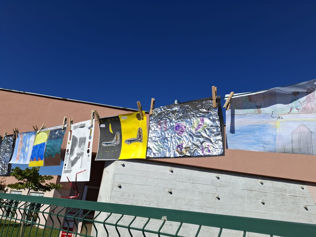 Ce projet propose aux enfants de suspendre une œuvre au format A4 sur un fil tendu à l’aide de pinces à linge, le temps d’une journée.