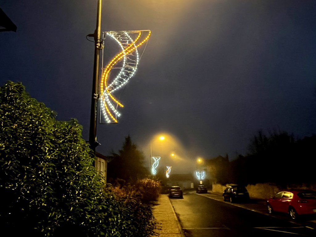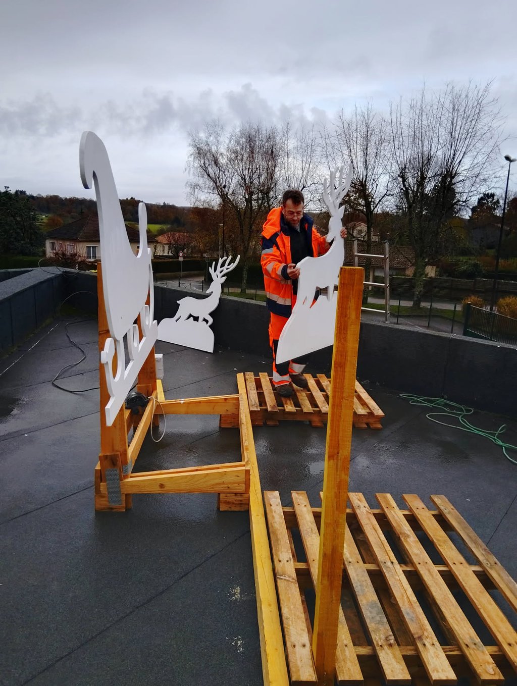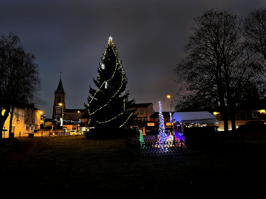 Sur la place de l’Église, jusque sur la façade de la Mairie, les lumières scintillent et se répondent, dévoilant le message de la Municipalité qui brille dans la nuit : « Joyeux Noël à tous ».
