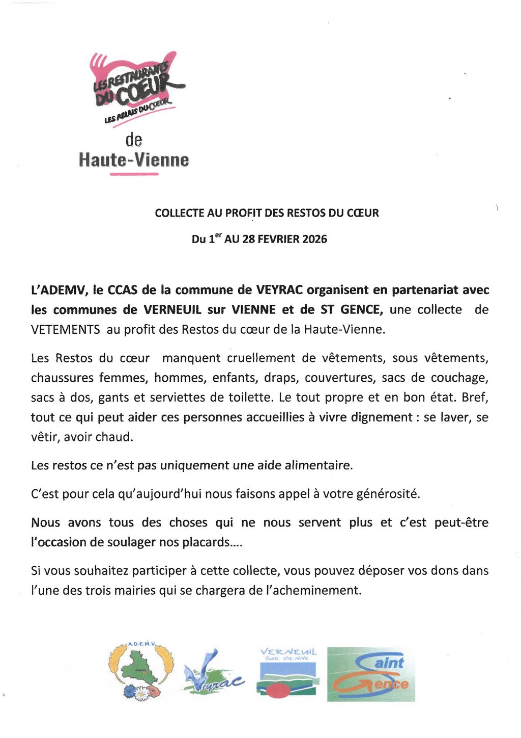 L'ADEMV, le CCAS de Veyrac organisent en partenariat avec les communes de Verneuil sur Vienne et ST Gence une collecte de vêtements au profit des Resto du cœur.