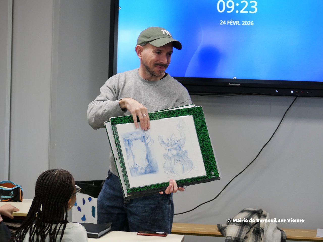 Les enfants et leurs enseignantes avaient préparé des questions à Jérémy Pailler : comment naissent ses personnages ? Comment un livre prend-il forme ? Pour répondre, Jérémy Pailler a sorti de ses carnets des esquisses originales, présentées sous forme de BD, illustrant les différentes étapes de création d’un chapitre. Les élèves ont ainsi pu découvrir les originaux de ses magnifiques illustrations, réalisées au crayon de couleur, suscitant admiration et curiosité.