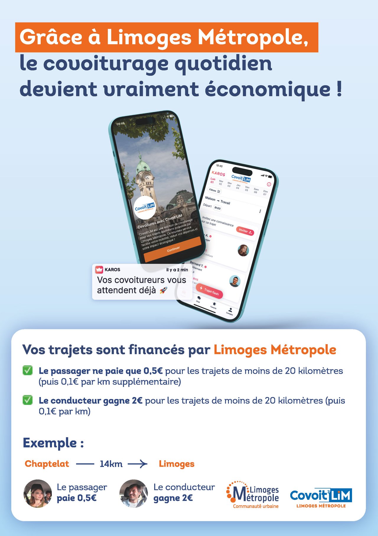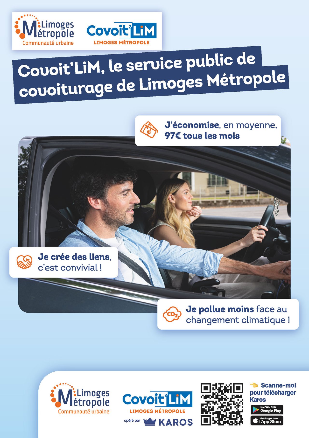 Limoges Métropole propose une nouvelle solution de covoiturage : COVOIT’LiM, un nouveau service en partenariat avec l’opérateur national Karos, pour une durée expérimentale de 8 mois.
