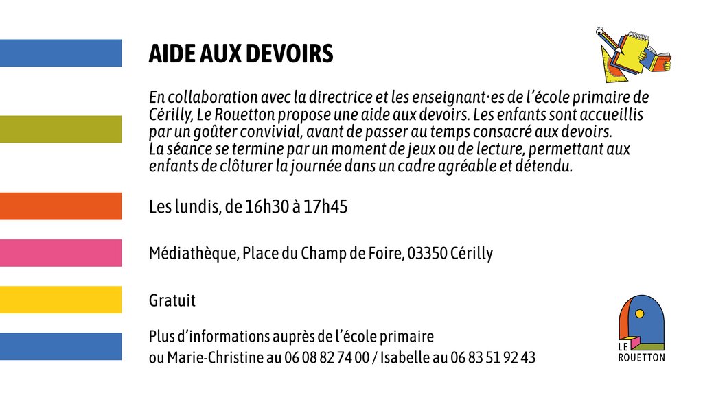 En collaboration avec la directrice et les enseignant⸱es de l’école primaire de Cérilly, Le Rouetton propose une aide aux devoirs. Les enfants sont accueillis par un goûter convivial, avant de passer au temps consacré aux devoirs.