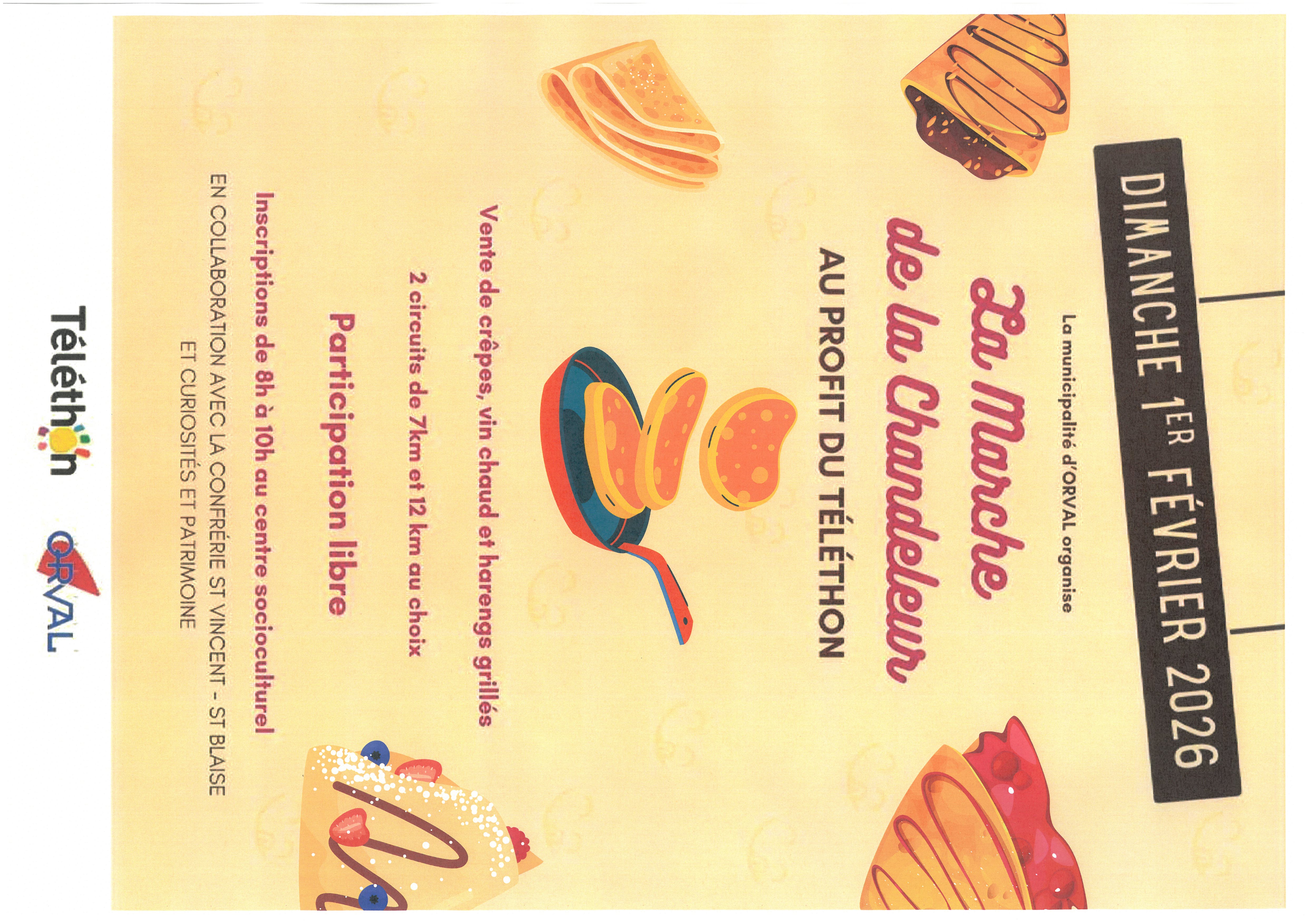 Venez marcher au profit du Téléthon avec cette randonnée au départ du Centre socioculturel. Vente de crêpes, vin chaud et harengs grillés. Départ entre 8h et 10h. Participation libre. 2 parcours au choix 7 et 12 km