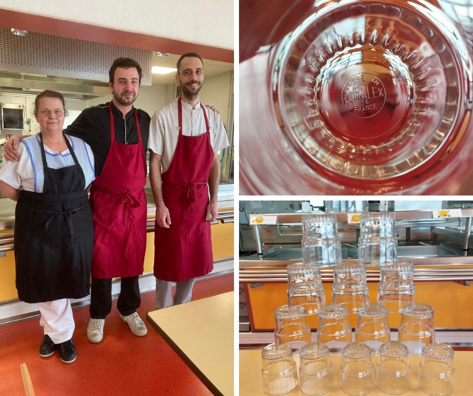 #Adieuleplastique Après le renouvellement de la vaisselle désormais en porcelaine, le restaurant scolaire s'équipe en verres Duralex, (ceux qui donnent l'âge !!) et les agents arborent leurs tous nouveaux tabliers lavables en tissu ♻️🌎