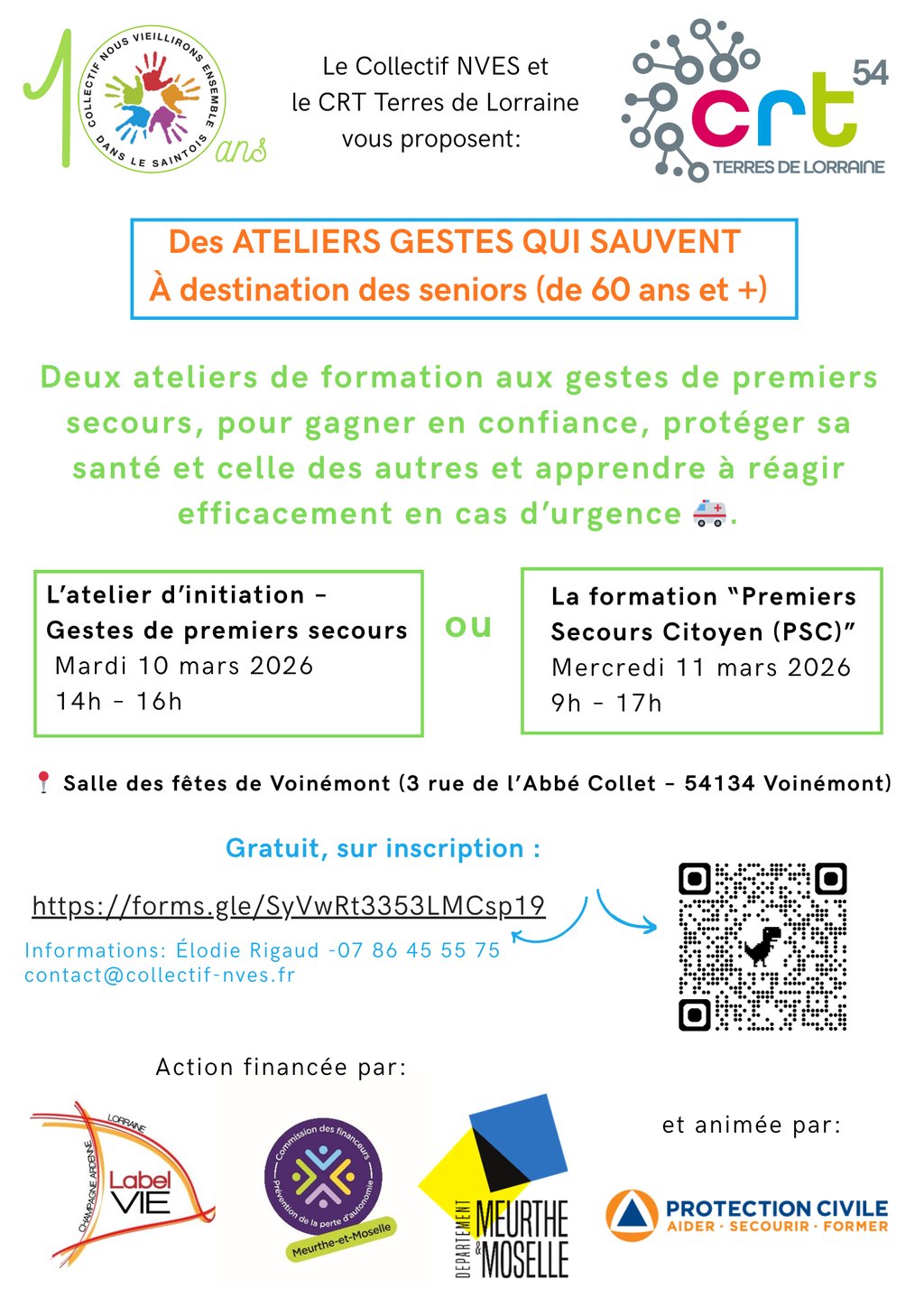 Le Collectif NVES – Nous Vieillirons Ensemble dans le Saintois, en partenariat avec le CRT Terres de Lorraine, a le plaisir de vous informer de l’organisation de deux ateliers de formation aux gestes de premiers secours, à destination des personnes de 60 ans et plus.